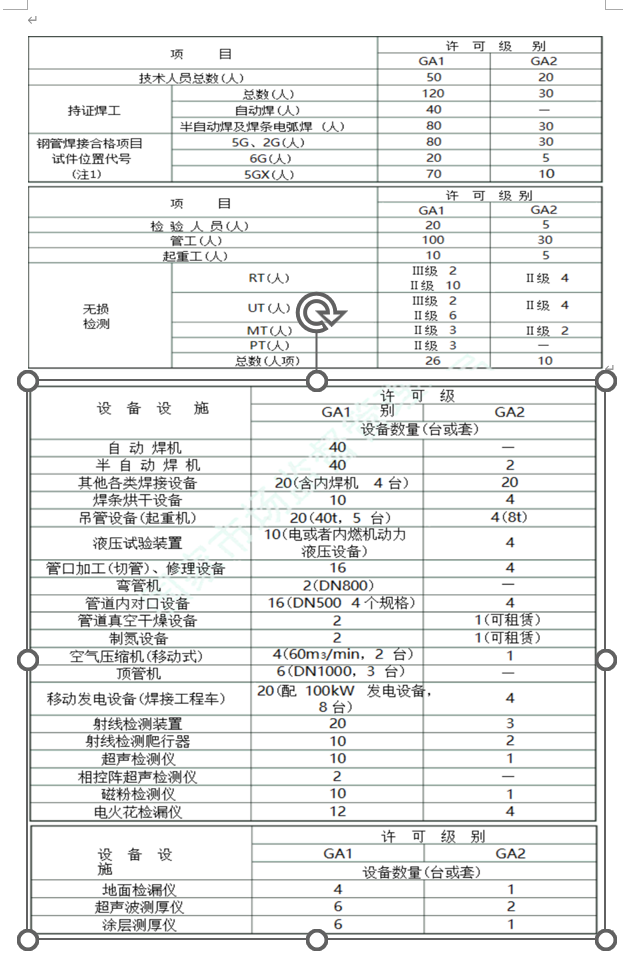 注2:從事長(cháng)輸管道(GA1)改造、重大修理的壓力管道安裝單位,其人員、生產(chǎn)場(chǎng)地、安裝設備及檢驗與試驗裝置除需要滿(mǎn)足長(cháng)輸管道 (GA2)安裝單位相應要求外,還應當具有以下條件:
